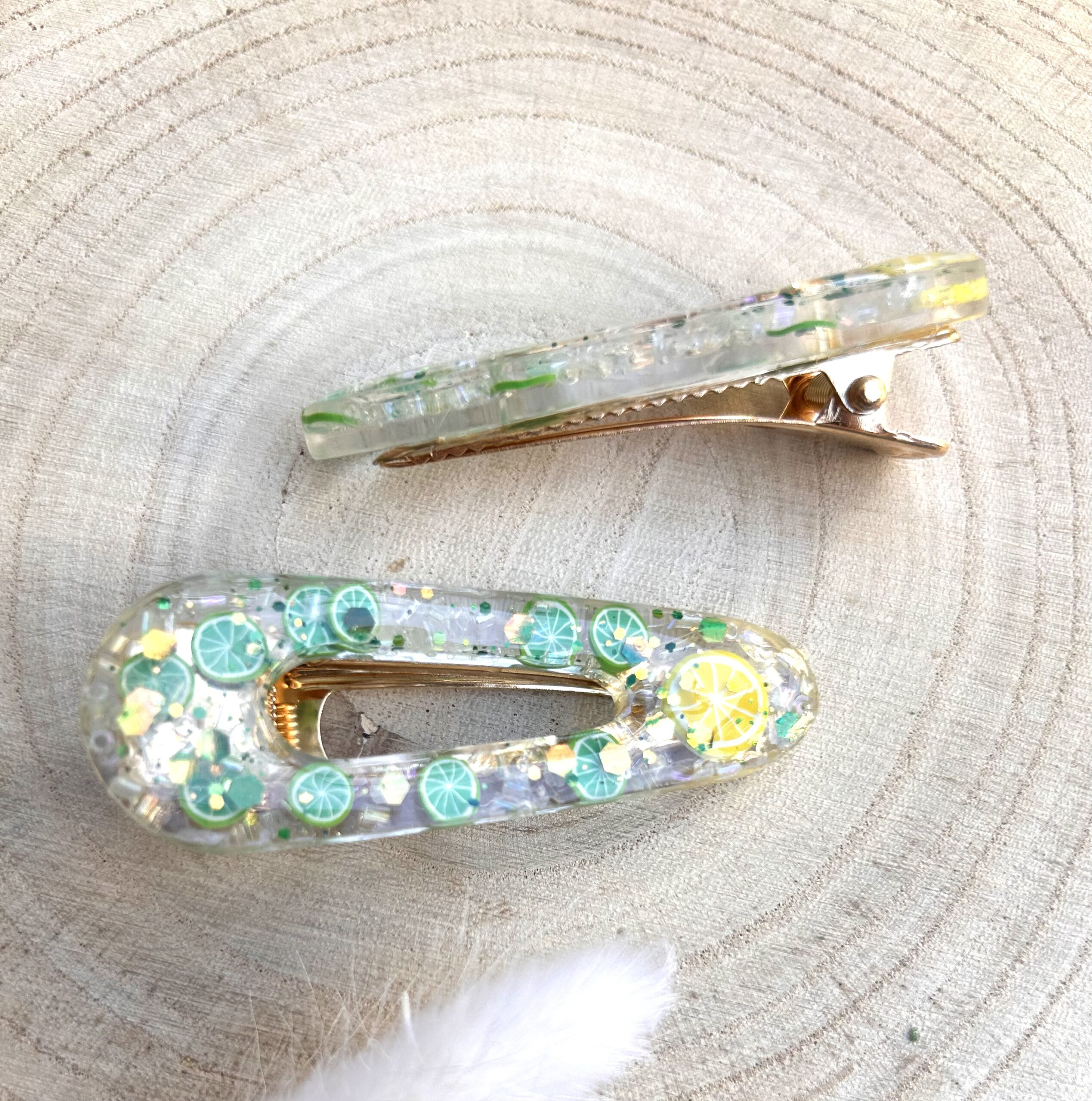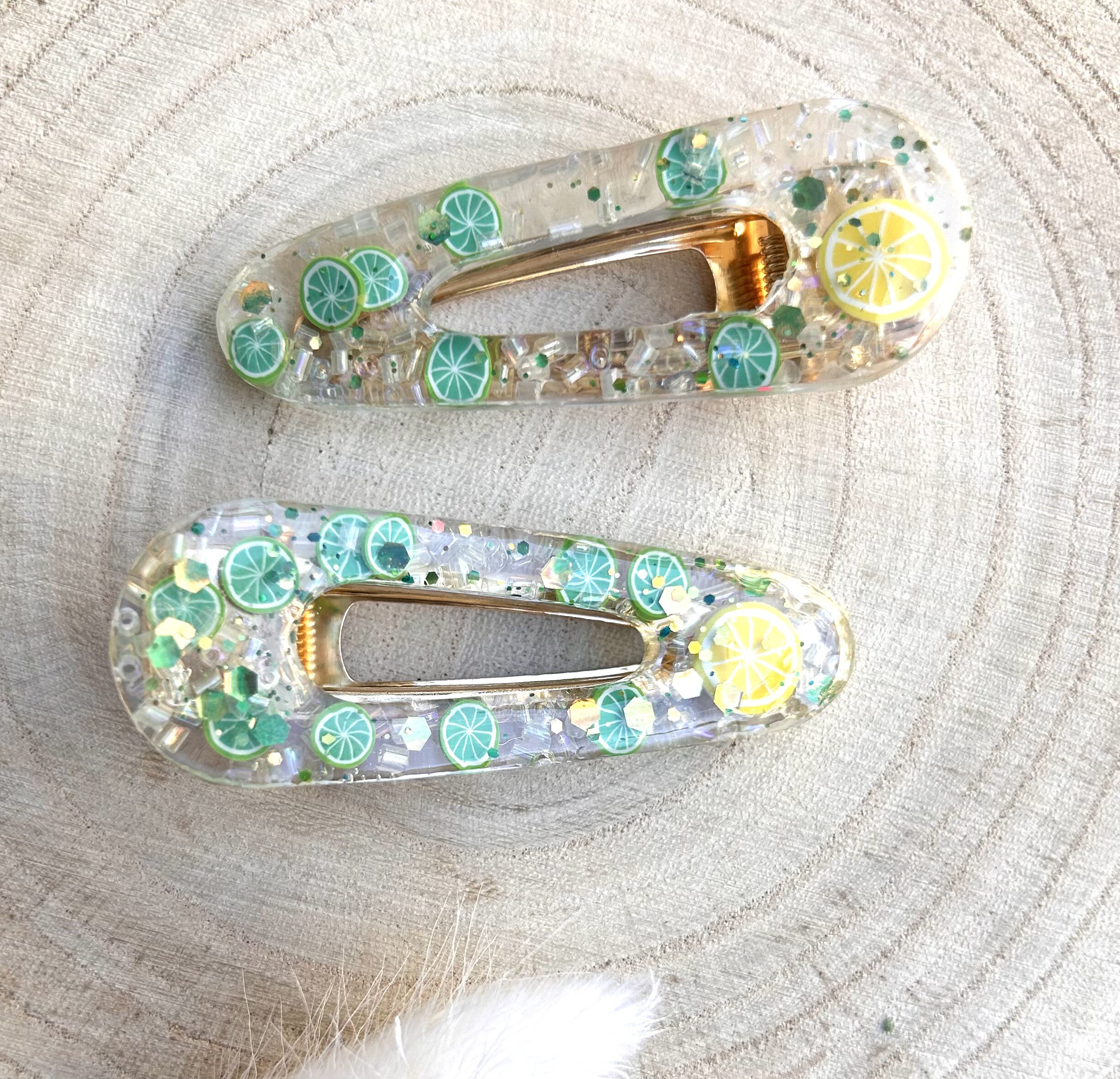 Diese süssen Haarspangen für Mädchen werden mit Epoxidharz und Glitzer in liebevoller Handarbeit hergestellt.