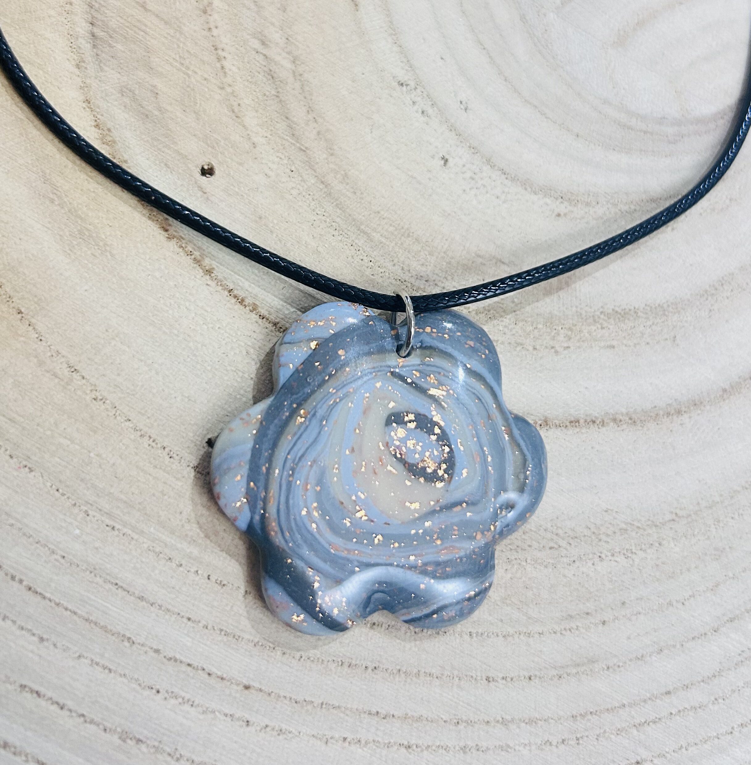 Diese Halskette besticht durch einen einzigartigen Anhänger in Blumenform, gefertigt aus Polymer Clay und veredelt mit Epoxidharz.