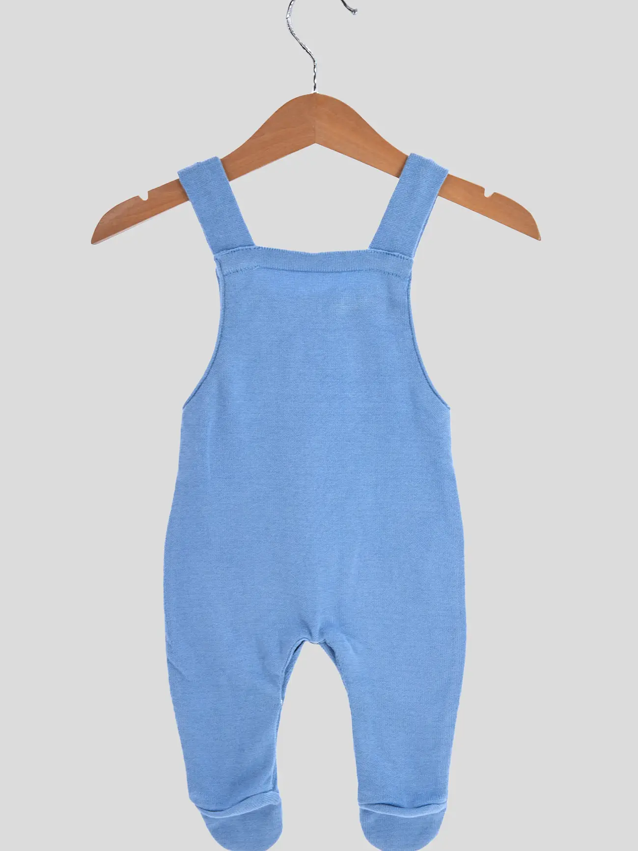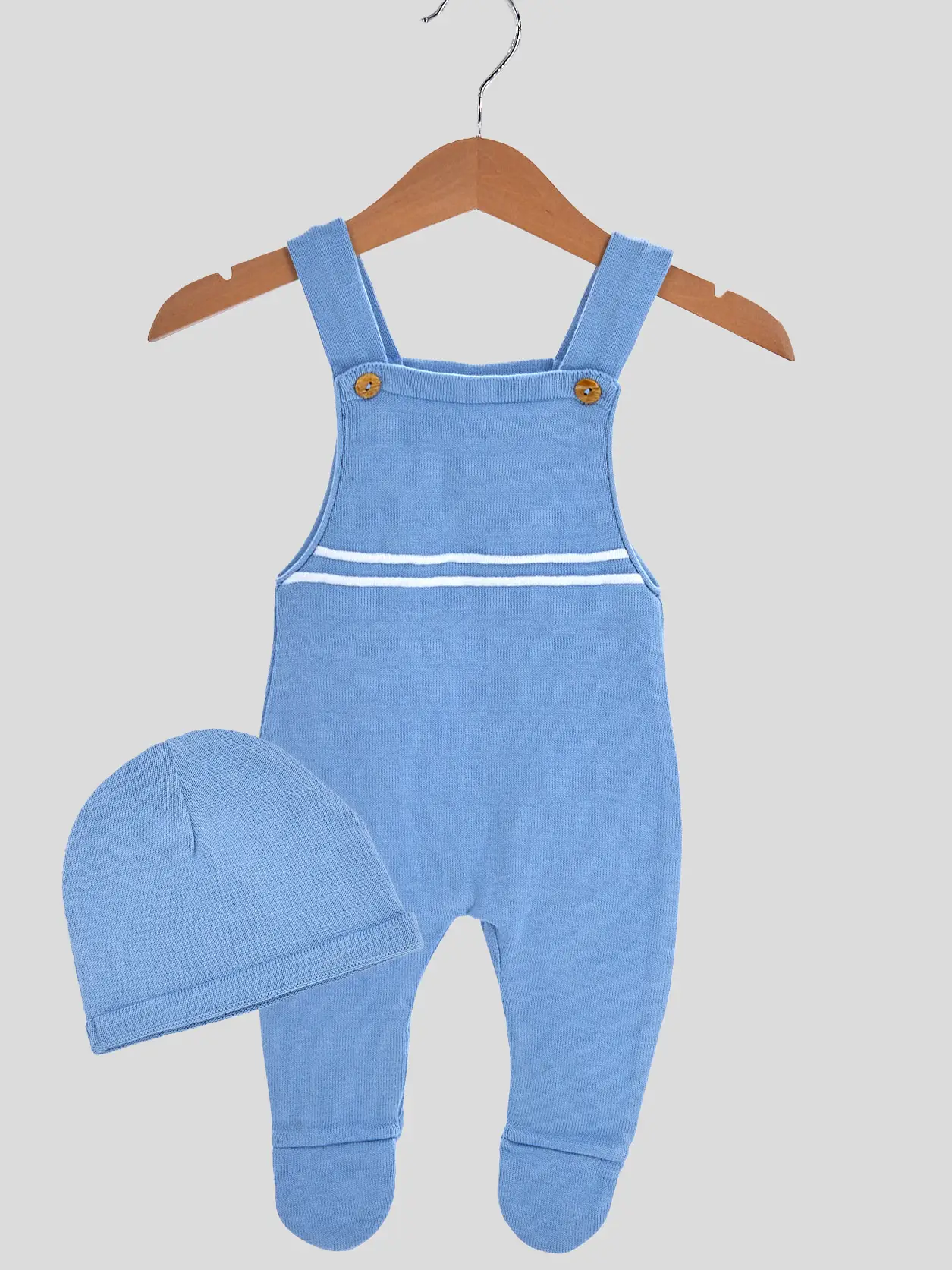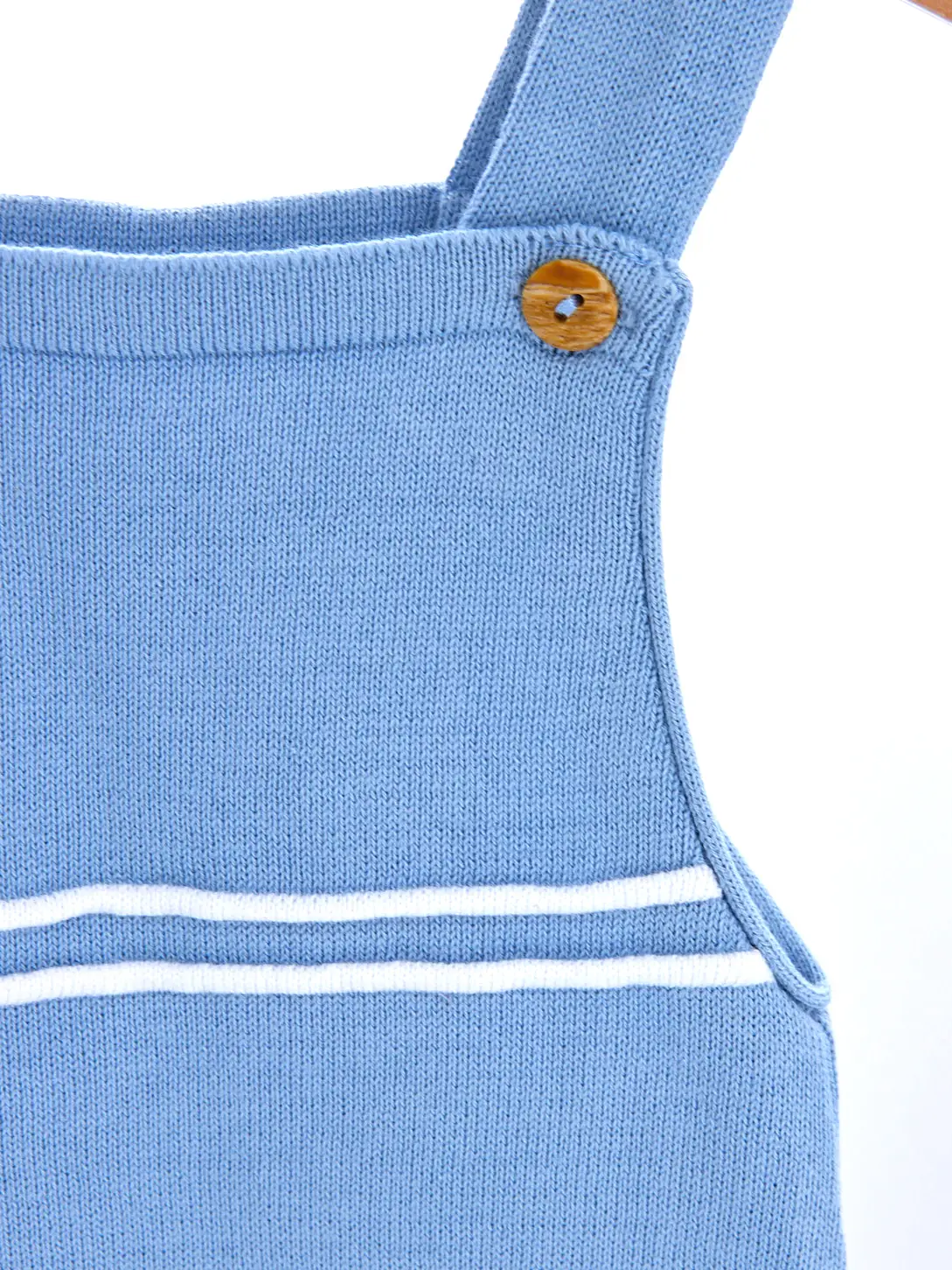 Latzhose und Mütze aus feinem Baumwollgarn mit Streifenmuster.